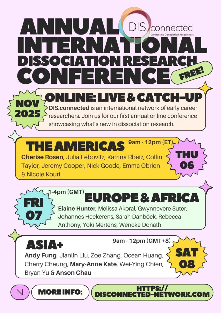 In November 2025, we hosted our first international dissociation research conference! It was free, online, and available across three time zones on three days. The link to the recordings will be sent to registrants soon!