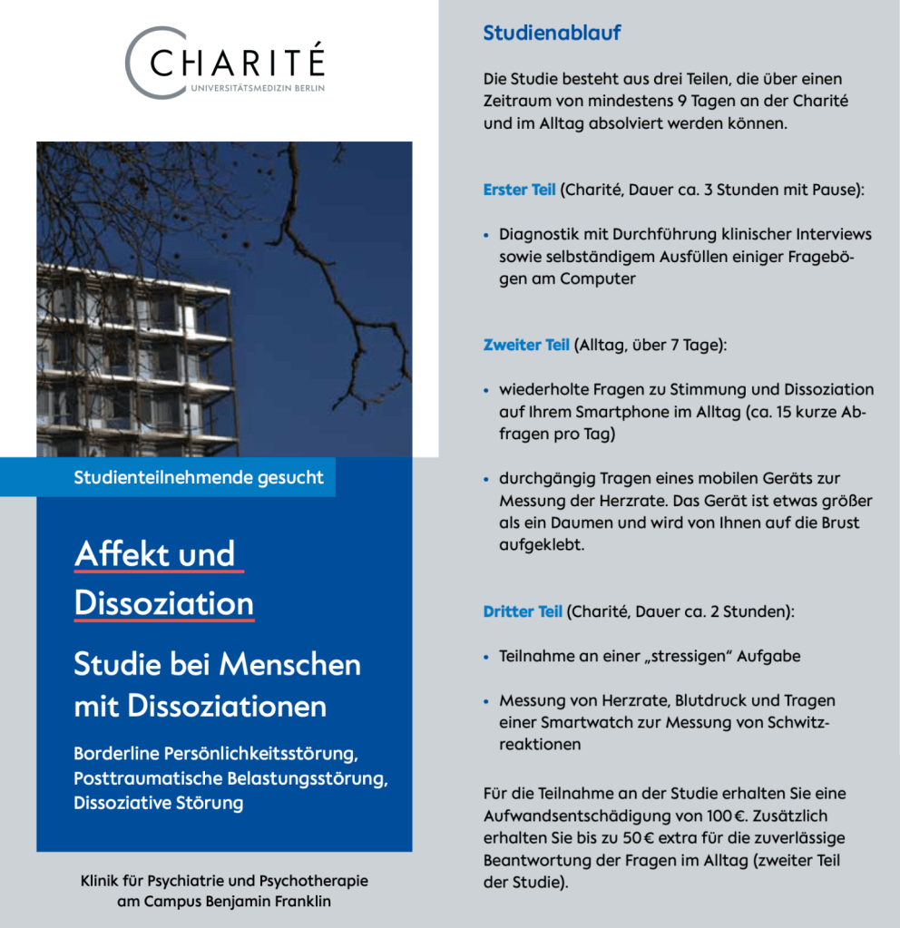 - regelmäßiges aktuelles dissoziatives Erleben im Alltag Diese und weitere Teilnahmevoraussetzungen werden in einem telefonischen Vorgespräch abgeklärt.