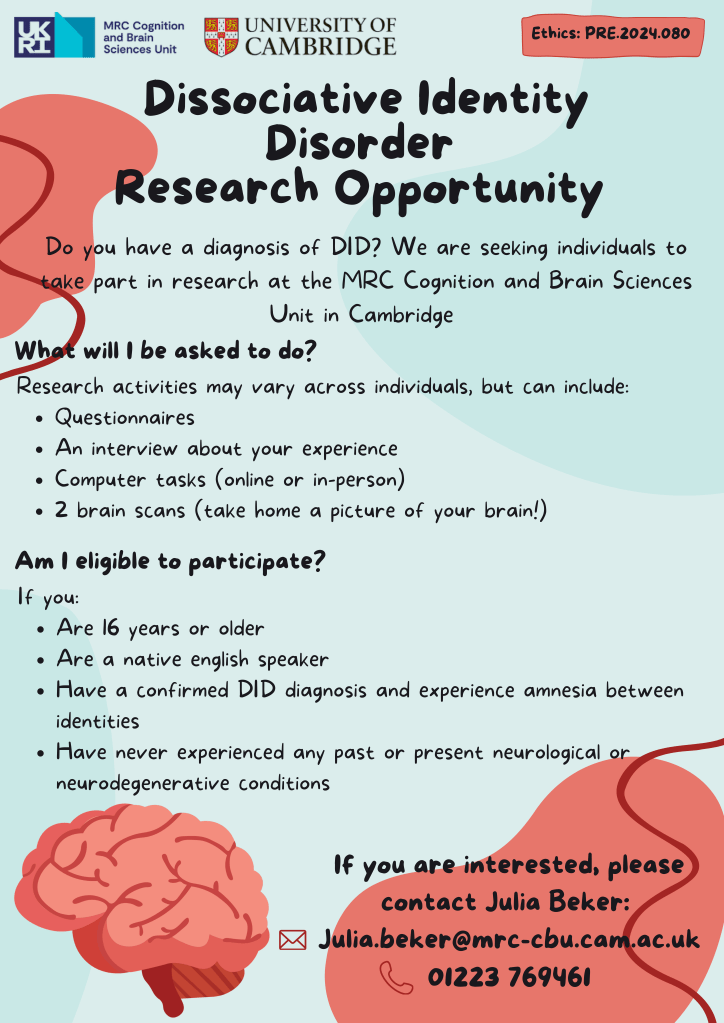 This study looks at memory processes in dissociative identity disorder. There are a number of tasks including a qualitative interview, questionnaires, a short experimental task, and the option for two MRI scans. Participants do not have to complete all tasks to be eligible.